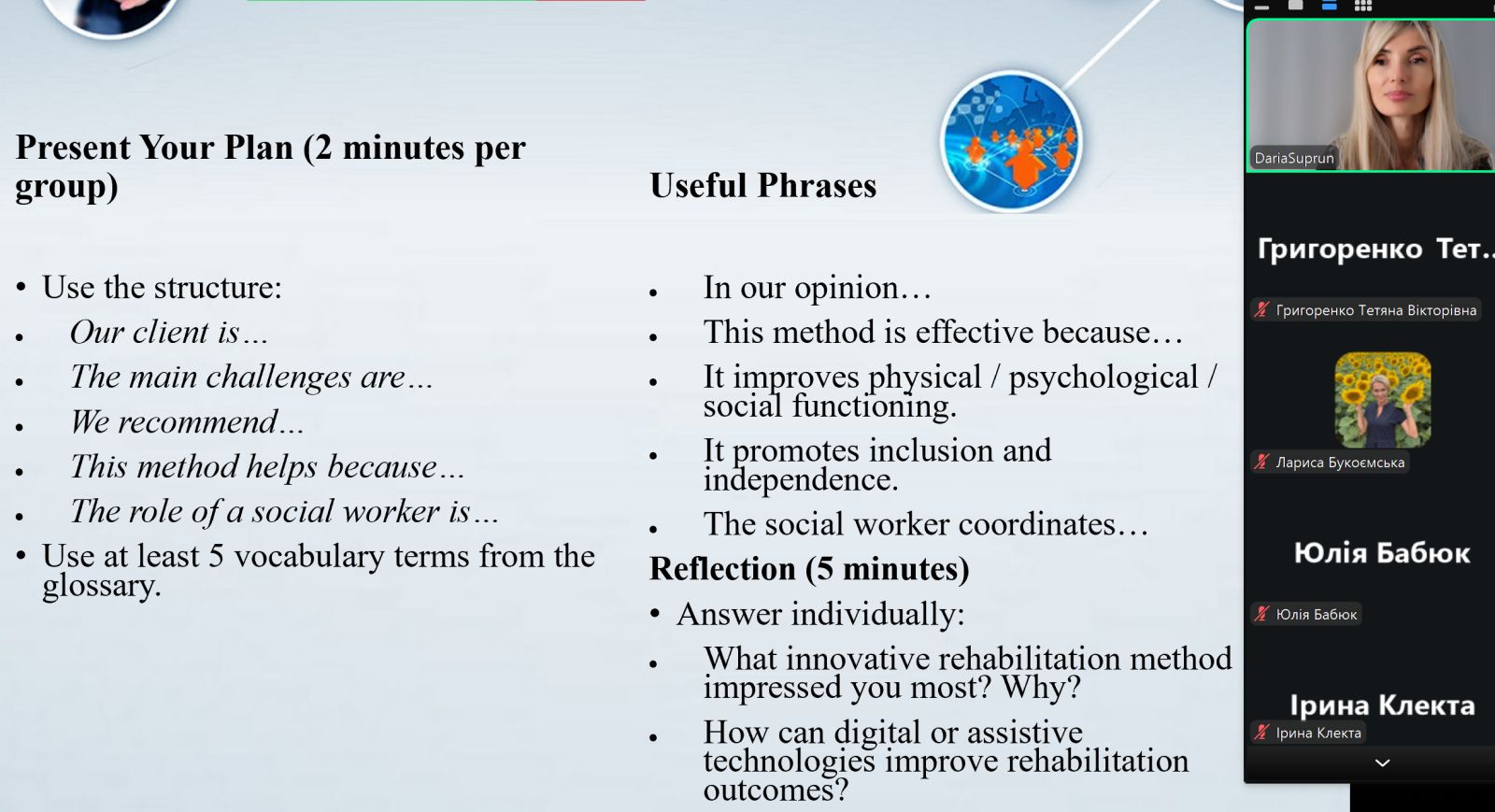 Після привітання студентів та оголошення теми заняття, засобом демонстрації короткого відео Integration of AI Rehabilitation Methods into Social Work відбулося відображення міждисциплінарності та зв’язку із попереднім навчальним матеріалом, активізація словника, зважаючи на двомовний аспект.