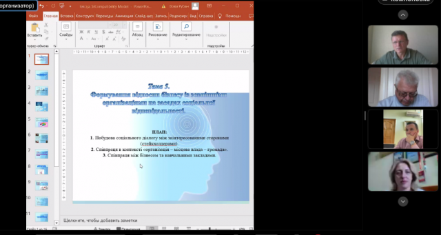 Відповідно до затвердженого графіку проведення відкритих лекцій у першому семестрі 2023-2024 навчального року, асистент кафедри економіки Рубан Ольга Олександрівна 22 вересня 2023 р. провела відкриту лекцію з дисципліни «Соціальна відповідальність бізнесу» для студентів 3 курсу ОС «Бакалавр» спеціальності 076 «Підприємництво, торгівля та біржова діяльність» освітньої програми «Підприємництво, торгівля та біржова діяльність». Тема лекції – «Формування відносин бізнесу із зовнішніми організаціями на засадах соціальної відповідальності». Заняття проходило онлайн, з використанням сервісу Cisco Webex Meetings.