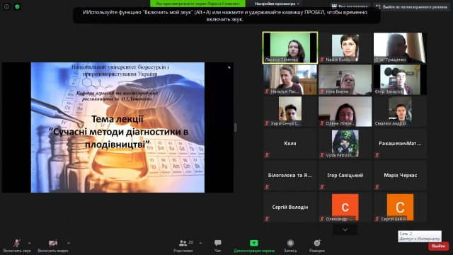 На онлайн-занятті були присутні представники викладацького складу кафедри Агрохімії та якості продукції рослинництва ім. О.І.Душечкіна. Заняття було проведене на високому навчально-методичному рівні й одержало схвальні відгуки, зокрема відзначено вміння зосередити увагу слухачів на головних положеннях матеріалу лекції, створити творчу та робочу атмосферу.