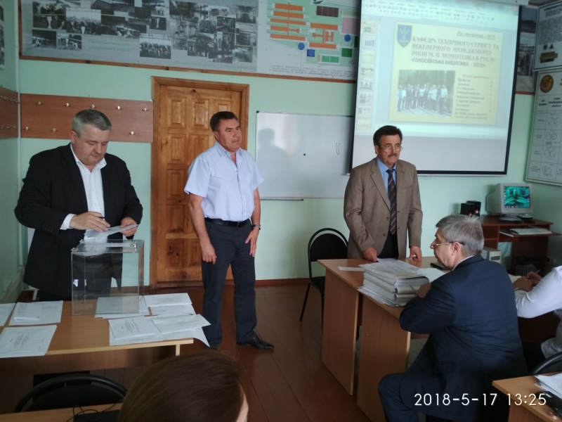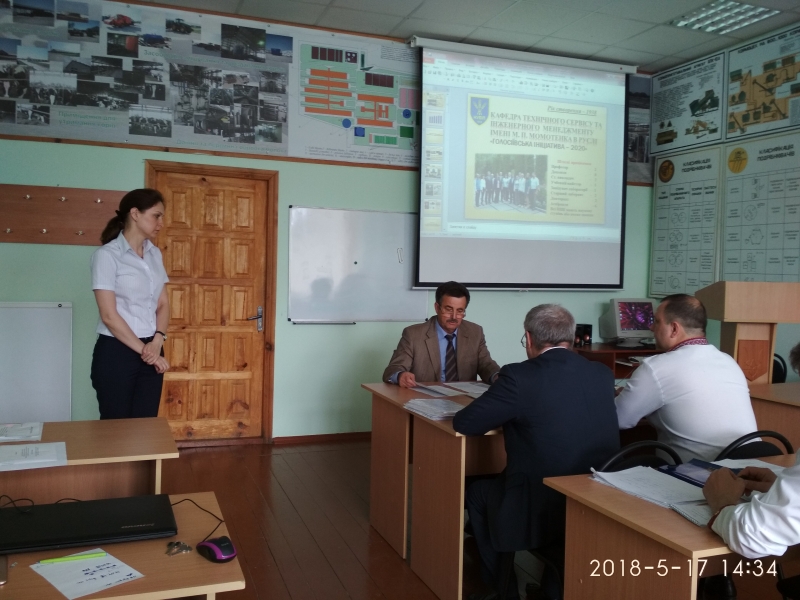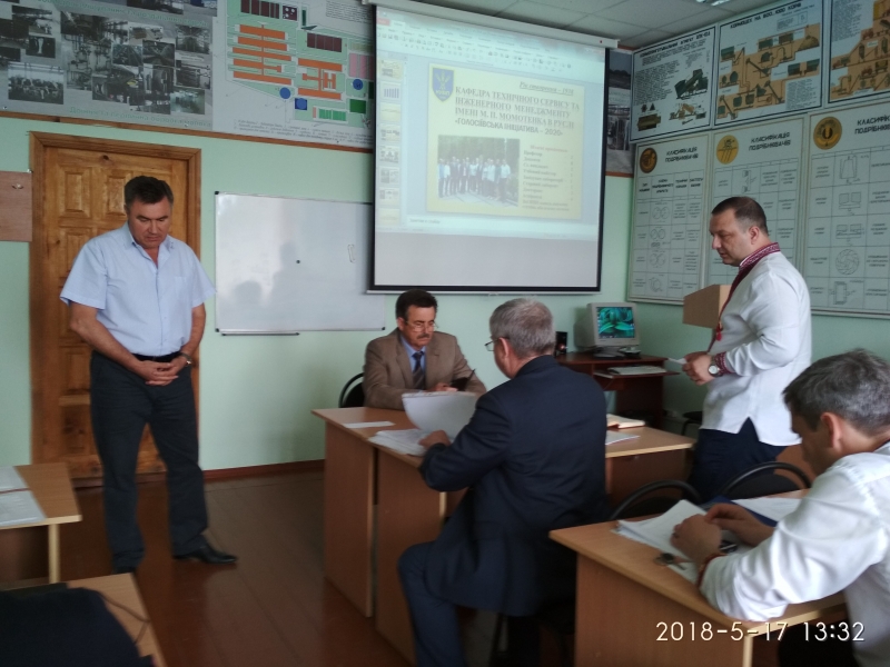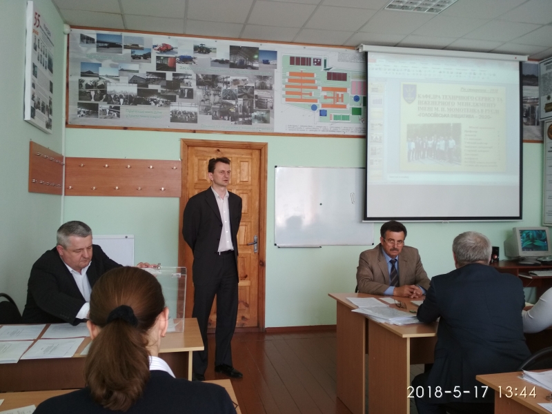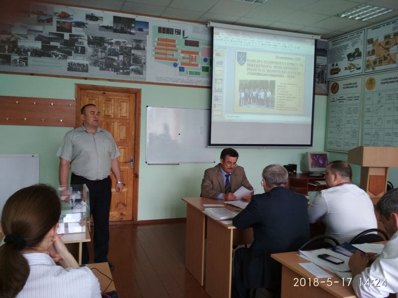 Про проведену роботу кафедри технічного сервісу та інженерного менеджменту імені М.П. Момотенка у світлі виконання заходів реалізації Програми розвитку НУБіП України «Голосіївська ініціатива 2020» на 2017/2018 н.р. доповів її завідувач д.т.н., проф. Войтюк В.Д. Він відмітив, що за рейтингом кафедра займає перше місце на факультеті. За минулий рік кафедра приймала участь у 7 Міжнародних виставках. На виставці «АГРО 2017» кафедра була нагороджена Золотою медаллю. За 2017 рік на кафедрі було видано 6 посібників, 3 монографії, 3 статті у Scopus, 28 статей у фахових виданнях та 32 тези доповідей на наукових конференціях. Поряд з цим члени вченої ради звернули увагу на покращення матеріальної бази кафедри.