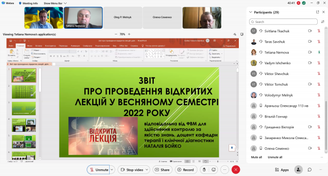 Першим питанням було запропоновано розглянути звіт доц. Наталія Бойко про проведені в цьому семестрі відкриті лекції. Доц. Бойка Наталія в своєму звіті зазначила, що за цей період було проведено 11 відкритих лекцій, всі лектори провели їх згідно вимог на високому науково-педагогічному рівні. Також вона висвітлила результати анкетування серед викладачів та студентів, які відвідали відкриті лекції і наголосила, що всі вони були високо оцінені. Всі лекції були цікаві, грунтовні. Всі лектори вільно володіють комп’ютерними технологіями, всі лекції містили відеоматеріали. Студенти зазначили що навіть у ці нелегкі для нашої країни часи вони з задоволенням чеколи на лекції. Серед зауважень у студентів було зазначено про недостатню кількість часу на більшість лекційного матеріалу, темп викладання та велику кількість питань під час лекцій. В обговоренні звіту виступили Володимир Духницький, Микола Малюк, Володимир Костюк, Микола Цвіліховський. Вони запропонували запрошувати до таких лекцій наших роботодавців, майбутніх абітурієнтів тощо. Додавати до лекцій відеоматеріали з наших виробництв та клінік. В цілому проведена робота була оцінена позитивно.