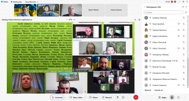 19 травня 2022 р. o 13:15 дистанцiйно вiдбулось засiдання вченої ради факультету ветеринарної медицини. З 31 членів ради на засіданні були присутні 29.