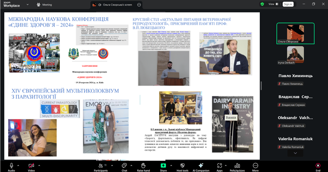 У Звіті про діяльність ради аспірантів факультету ветеринарної медицини за 2024-2025 рр. доповідач Ольга КРАСНОВИД зупинилась на стану виконання запланованих завдань упродовж звітного періоду: участі аспірантів у наукових заходах, їх закордонних стажуваннях тощо.