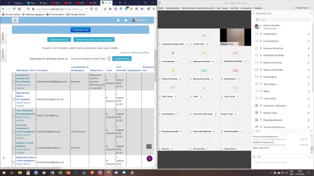 Сьогодні відбувся екзамен з дисципліни «Моделювання та прогнозування стану довкілля» у студентів 1 групи 4 курсу спеціальності «Екологія». Під час екзамену студенти складали тест в системі E-learn та відповідали на теоретичні питання під час співбесід в системі Wеbex.