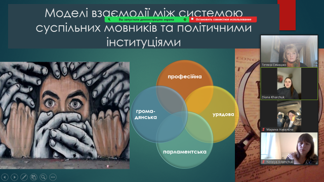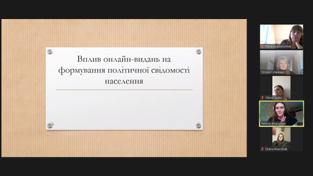 Магістри дослідили теми в контексті політичної журналістики: «Особливості PR-забезпечення політичної діяльності під час виборів» (виконавець Анастасія Старченкова, науковий керівник проф. Микола Степаненко); «Вплив онлайн-видань на формування політичної свідомості населення» (виконавець Тетяна Федорчук, науковий керівник проф. Марина Навальна) та ін. Такі дослідження вкрай важливі та актуальні, враховуючи перспективу політичних виборів, та кількість дискусійних тем, які щодня з’являються в інформаційному просторі.