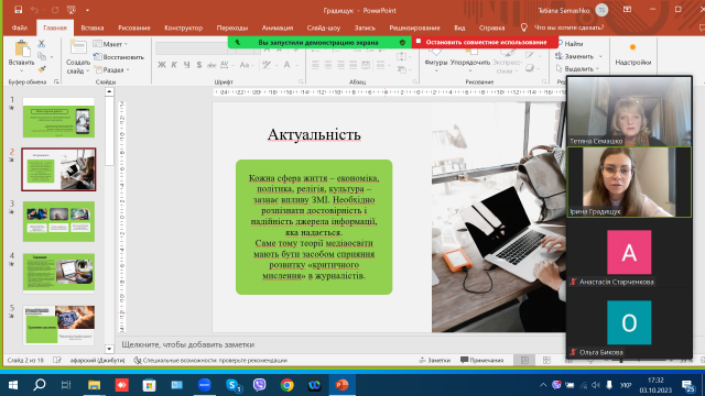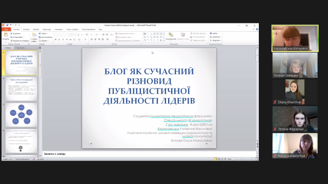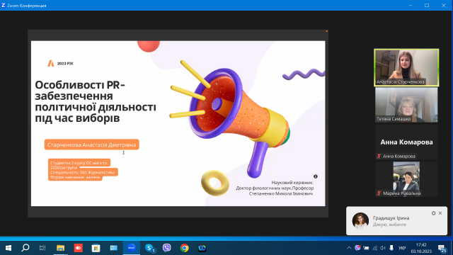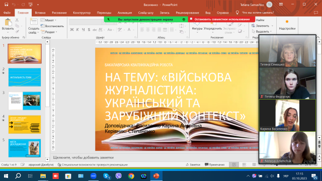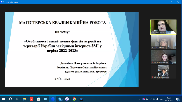 3 жовтня 2023 року на кафедрі журналістики та мовної комунікації з метою вдосконалення студентських наукових праць та підготовки до їх захисту у дистанційному форматі відбувся попередній захист магістерських робіт студентами денної та заочної форм навчання.