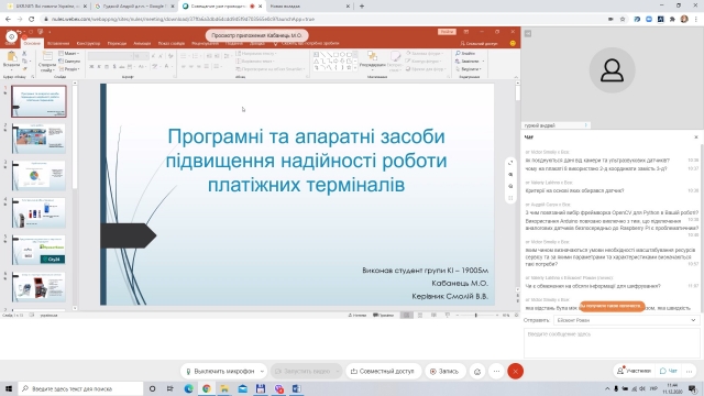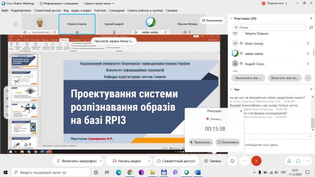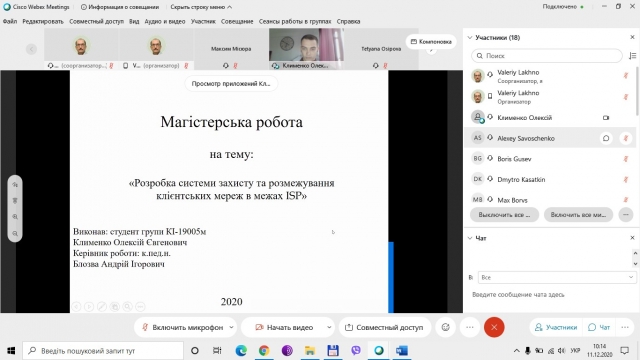 11 грудня 2020 р. завершила роботу Екзаменаційна комісія по захисту магістерських робіт студентами денної форми навчання за ОП «Комп’ютерні системи і мережі». До захисту було представлено 9 магістерських робіт. Відбувся захист онлайн.