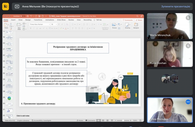 Студенти дізналися про теоретичні та практичні аспекти здійснення трудової діяльності, зокрема про праву на працю, особливості укладення трудового договору, робочий час та час відпочинку. Окрему увагу лекторка приділила питанню розірвання трудового договору з ініціативи роботодавця, на реальних прикладах продемонструвала важливість дотримання чинного законодавства, а також можливість оскаржити будь-яке незаконне звільнення в судовому порядку.