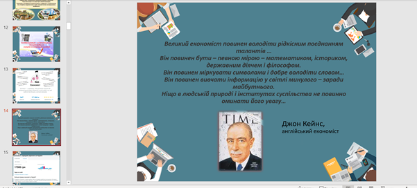 Лектором було наведено влучні цитати видатних економістів про важливість майбутнього фаху економіста, а також цікаві приклади з життя успішних економістів для усвідомлення студентами значущості обраного ними фаху та необхідності подальшого пізнання й розвитку в даному напрямку.