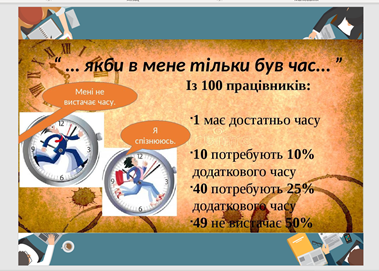 Надзвичайно важливим для гармонійного функціонування особистості, навчання в студентські роки, з метою осягнути головне і не перевтомитися, а також у професії економіста є важливим розвиток такої навички як тайм менеджмент. Тому, велику зацікавленість у студентів викликало таке питання лекції, яке було винесено на розгляд, як управління часом в професії економіста. Лектор ознайомила з поняттям тайм-менеджменту, важливістю його опанування для фаху економіста, а також з основними методиками, які можливо наразі застосувати в студентському житті та навчанні (бо дотримання дедлайну суттєво впливає на позитивну оцінку за виконання завдань), а в майбутньому і для успішного становлення фахівця-економіста.