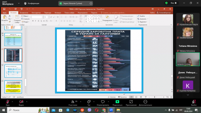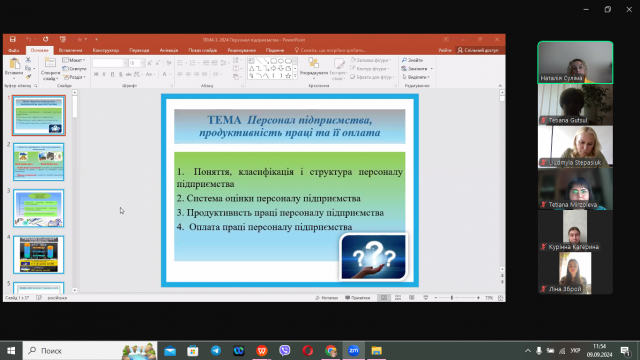 Розкриваючи зміст лекції, лектор детально висвітила основні питання, що стосувалися теми. В доступній формі до студентів була донесена характеристика персоналу підприємства, розкрита система його оцінки, показники продуктивності праці, а також сутності, видів, форм та систем оплати праці персоналу підприємства.
