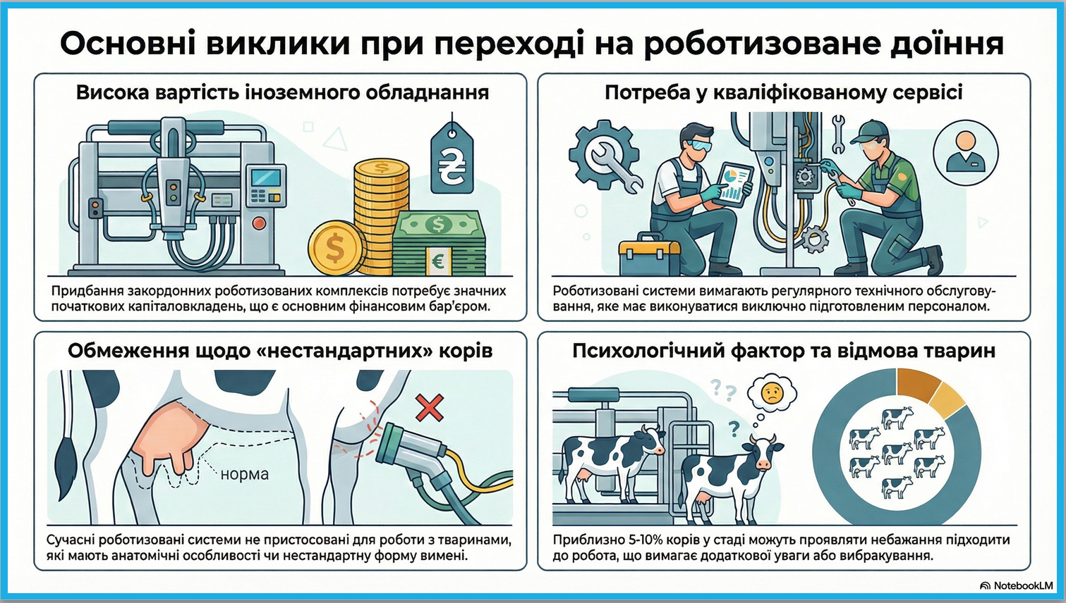 Під час лекції були висвітлені питання класифікації доїльних установок та їх порівняльної оцінки. Особлива увага була приділена роботизованим доїльним системам, особливостям конструкцій доїльних роботів провідних світових фірм-виробників. Лекторка підкреслила переваги переходу на роботизоване доїння та основні виклики, які постають при цьому перед підприємцями.