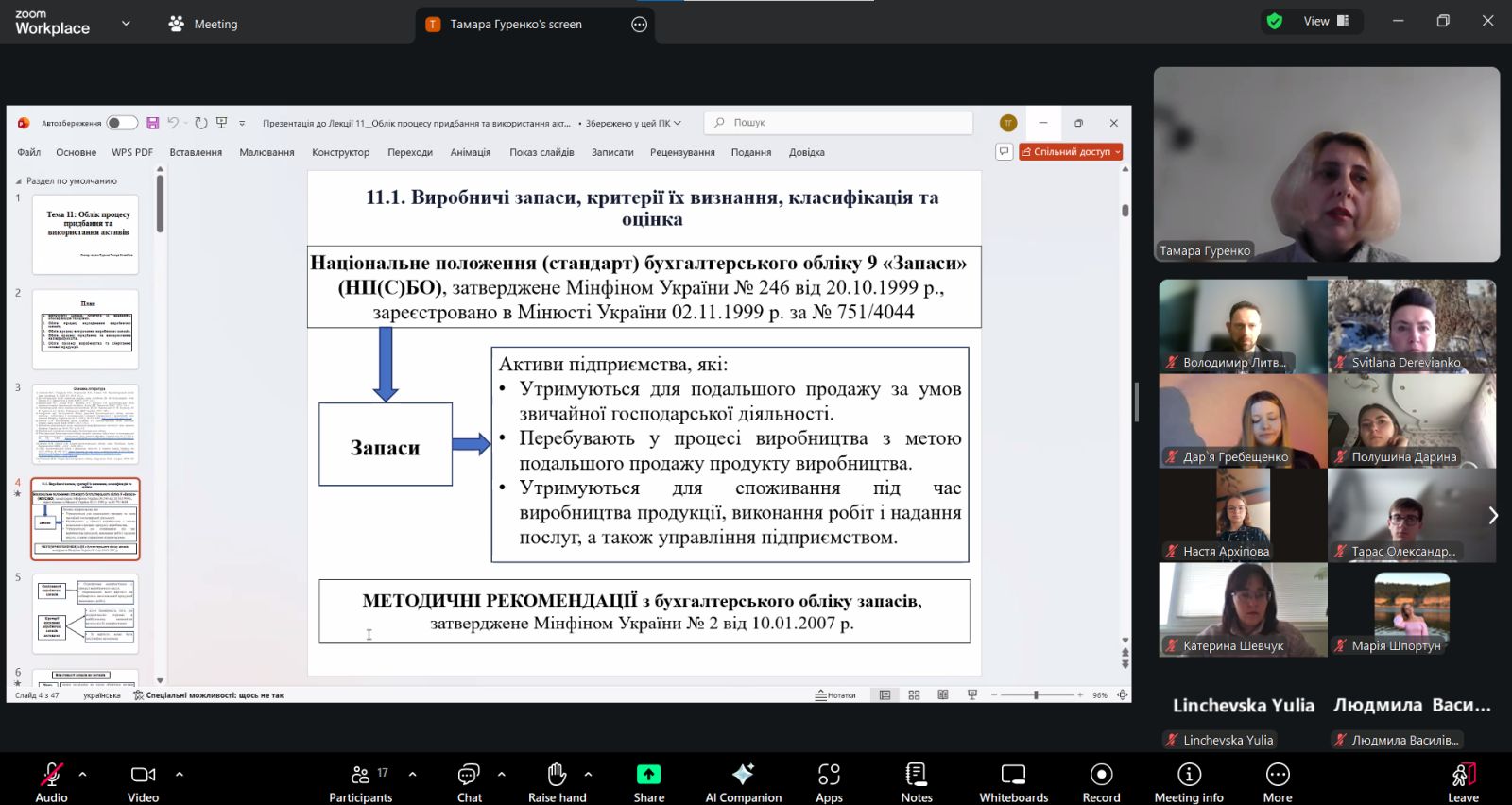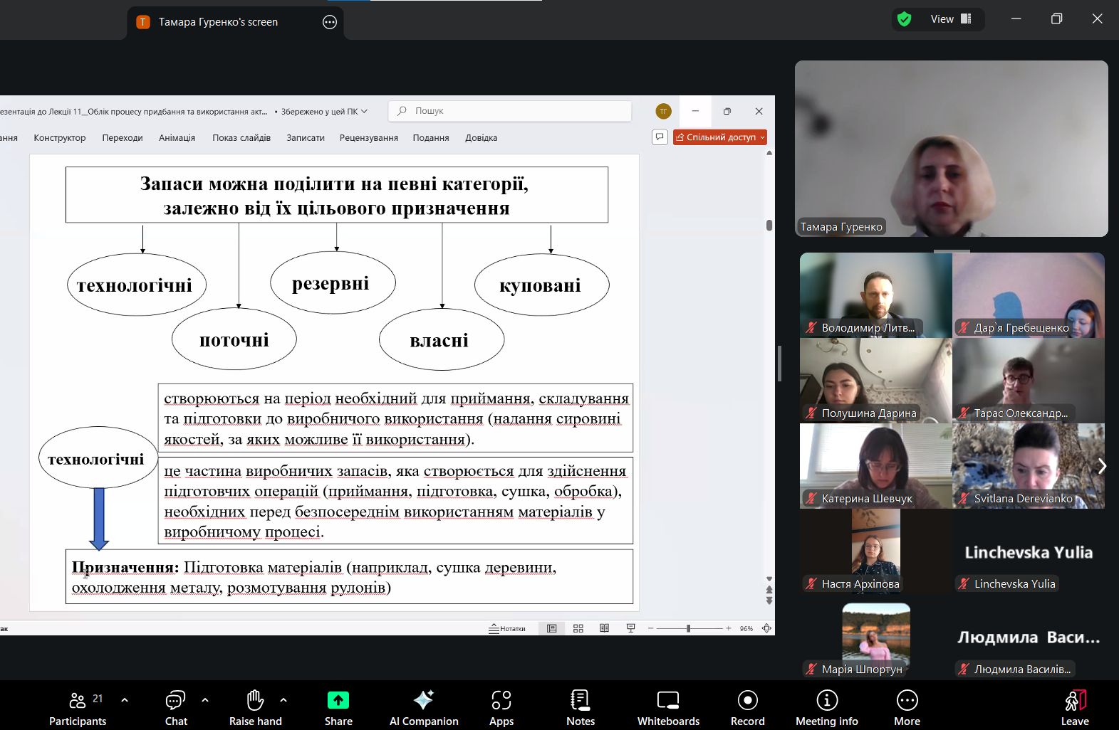 Лекція присвячена теоретичному дослідженню запасів як економічної категорії та їх класифікації в бухгалтерському обліку. Тамара Гуренко ознайомила здобувачів із нормативною базою та навчальною літературою з питань теми заняття. Значна увага приділена класифікації запасів, що має на меті згрупувати в обліку активи таким чином, щоб їх зручно було обліковувати та визначені правила їхнього відображення відповідно до Національних положень (стандартів) бухгалтерського обліку. Також на занятті досліджено різноманітні підходи щодо особливостей визнання виробничих запасів на підприємствах, проаналізовано основні способи формування оцінки запасів. Велася жвава дискусіящодо класифікації запасів та їх відображення в обліку при надходженні на підприємство.
