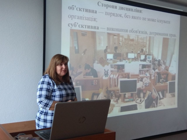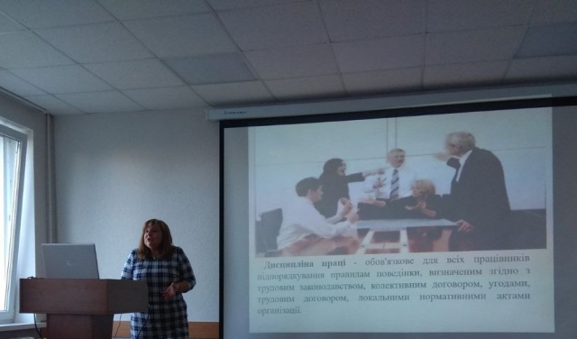 Викладач активізувала знання студентів здобуті під час вивчення інших дисциплін та попередніх тем курсу, спонукала їх до логічних міркувань та порівнянь, до вираження власної думки. Під час лекції студенти ознайомилися з суттю та змістом поняття трудової дисципліни її класифікацією, методами забезпечення дисципліни праці, а також дізналися шляхи зміцнення трудової дисципліни у колективі.