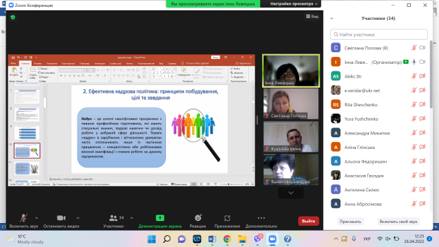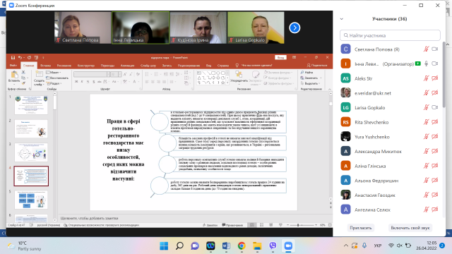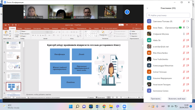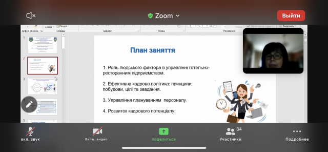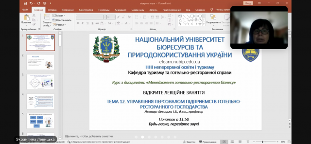 26 квітня 2022 року відбулося відкрите лекційне заняття з дисципліни «Менеджмент готельно–ресторанного бізнесу» на тему «Управління персоналом підприємств готельно–ресторанного господарства» для здобувачів вищої освіти ОС «Бакалавр» зі спеціальності 241 «Готельно-ресторанна справа» за освітньою програмою «Готельно-ресторанний бізнес», лекторка – Інна Левицька, д.е.н., професор, зав. кафедри готельно-ресторанної справи та туризму НУБіП України.