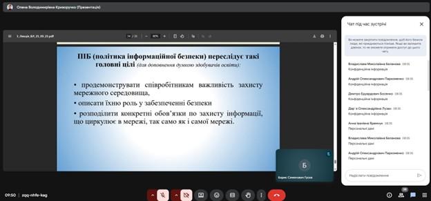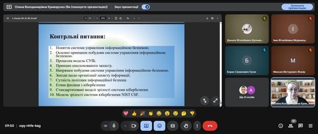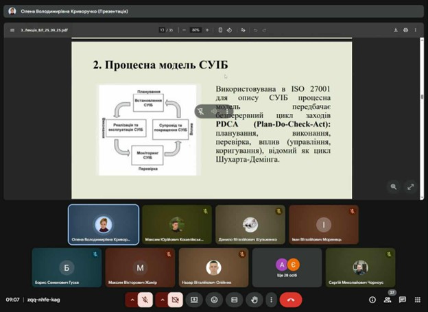 Лекція розпочалася з короткого огляду матеріалу попередньої лекції. Студенти активно долучились до обговорення – надавали відповіді в чаті. Далі було розглянуто основні питання лекції, а саме що система управління інформаційною безпекою має цілком відповідати основним принципам стандарту ISO 27001:2023 (ISO/IEC 27001:2022, IDT) «Інформаційна безпека, кібербезпека та захист конфіденційності. Системи керування інформаційною безпекою. Вимоги». Зупинились на вивченні процесної моделі СУІБ, що передбачає безперервний цикл заходів PDCA (Plan-Do-Check-Act): планування, виконання, перевірка, вплив (управління, коригування), також відомої як цикл Шухарта-Демінга.