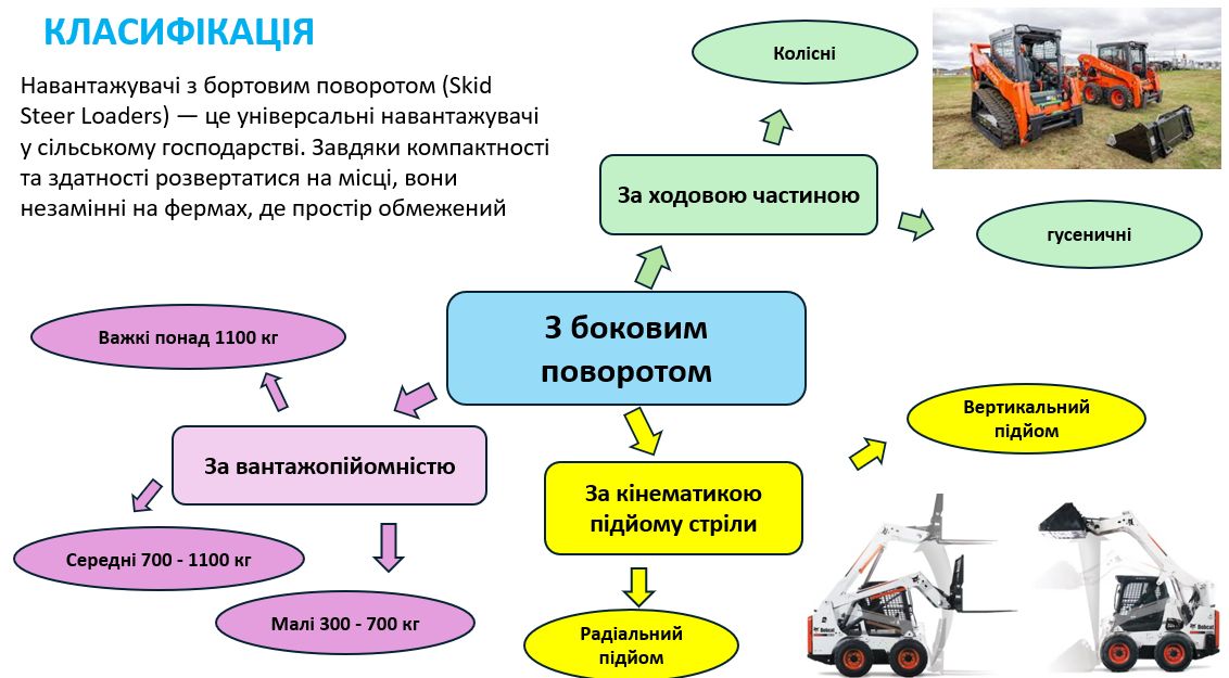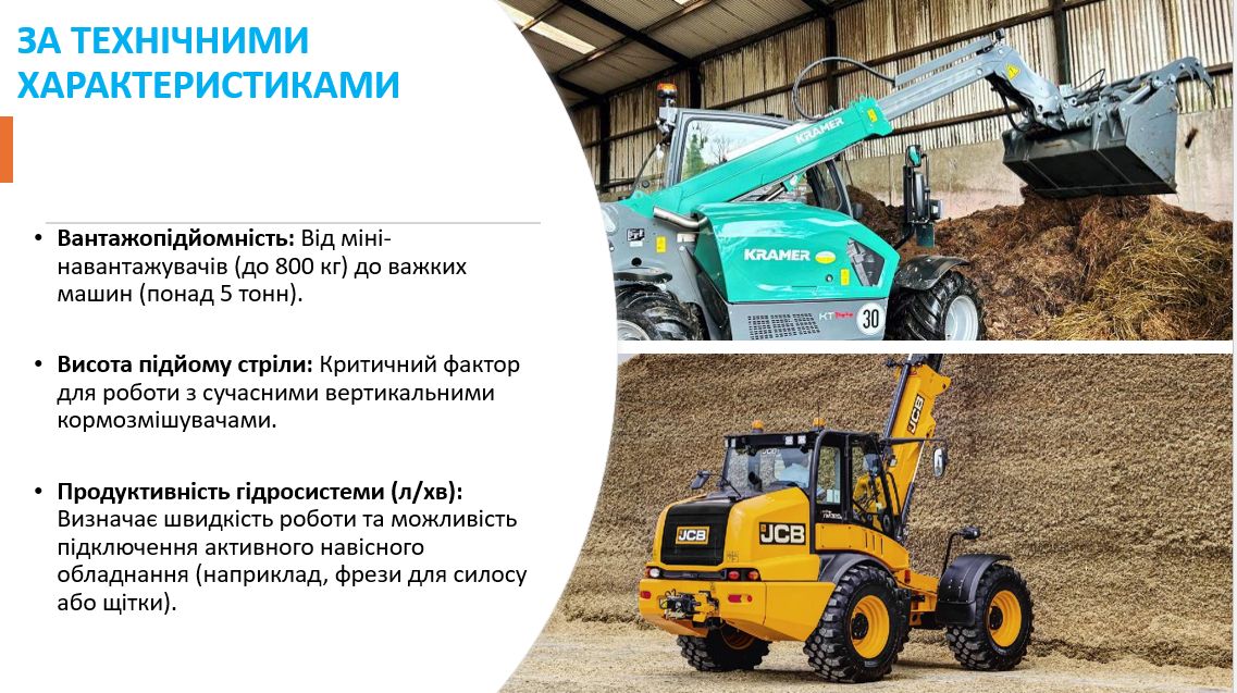 У ході лекції висвітлено основні типи роздавачів, таких як телескопічні, фронтальні, вилочні, з бортовим поворотом. Телескопічні навантажувачі більш ефективні для високого підйому та роботи в полі, фронтальні - універсальні ковшові для сипучих матеріалів, вилочні - для складської логістики та піддонів. Роздавачі забезпечують високу прохідність, мобільність та можливість використання навісного обладнання, такого як ковші, захвати для рулонів, вила. Лектор зупинився на конструкції різних типів роздавачів, технічних характеристиках, особливостях використання. Подав порівняльну характеристику навантажувачів та параметри їх вибору.