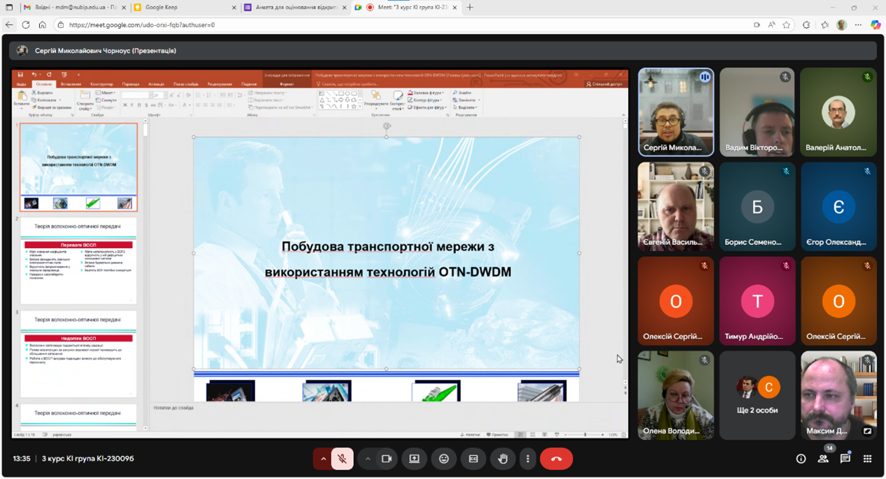 Лекція розпочалася з короткого огляду теорії волоконно-оптичних систем. Студенти активно долучились до обговорення – надавали відповіді в чаті. Далі було розглянуто основні питання лекції, а саме принципи побудови мереж OTN та їх інтеграція з технологією спектрального ущільнення DWDM.
