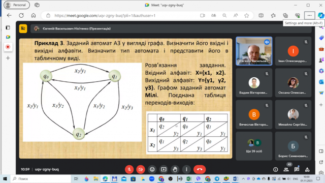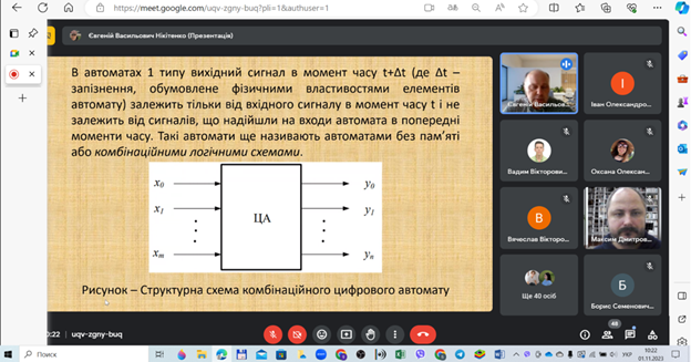 Під час проведення відкритої лекції Євгеній Васильович наголосив, що процес функціонування автомата полягає у тому, що при подачі на його вхід деякої послідовності вхідних сигналів, він переходить з одного стану в інший і формує послідовність вихідних сигналів.