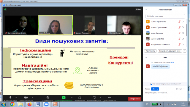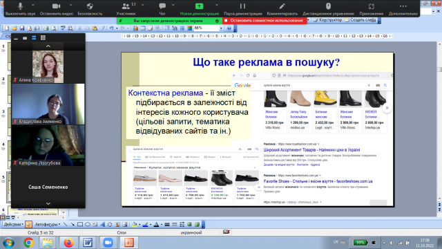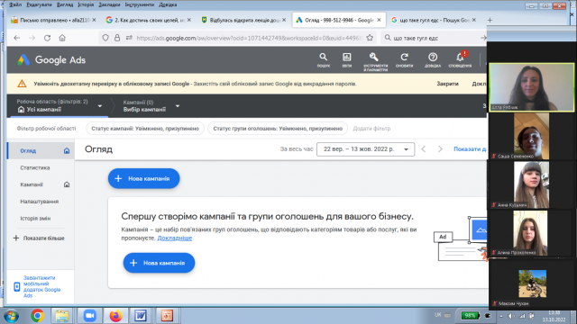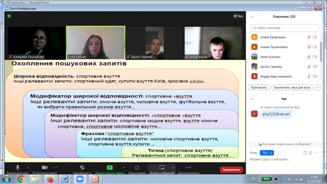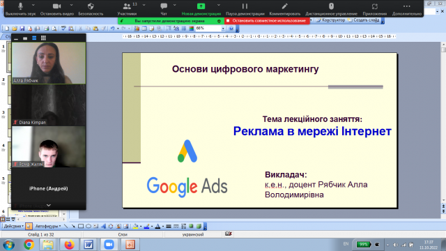 Тема відкритої лекції: «Реклама в мережі Інтернет» (дисципліна «Основи цифрового маркетингу»). В процесі лекції Рябчик А.В. розкрила наступні питання: види, формати і завдання реклами в мережі Інтернет, зокрема в пошуку Google і в контекстно-медійній мережі; платформи, на яких розміщуються і показуються реклами; види запитів (інформаційні, навігаційні, транзакційні, брендові та по конкурентах), частотність запитів; формування рейтингу рекламних оголошень; типи відповідностей та їх застосування; тергетинг; структура рекламних оголошень. Також було ознайомлено з рекламною програмою Google Ads.