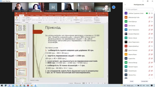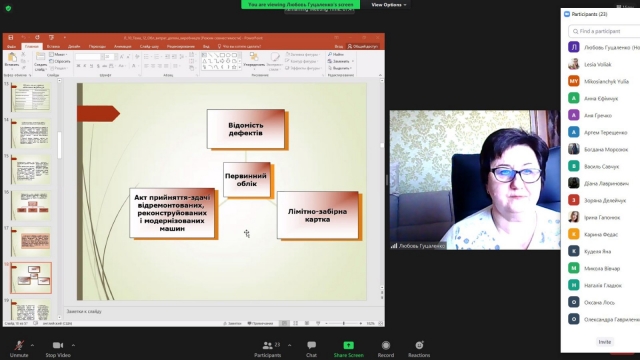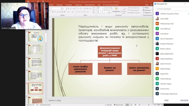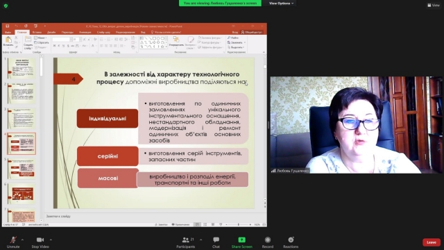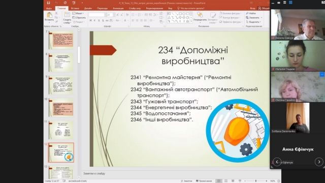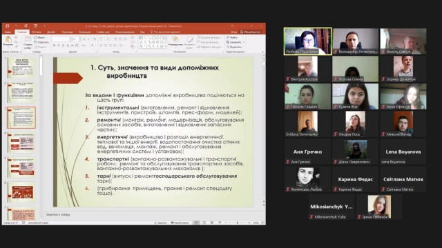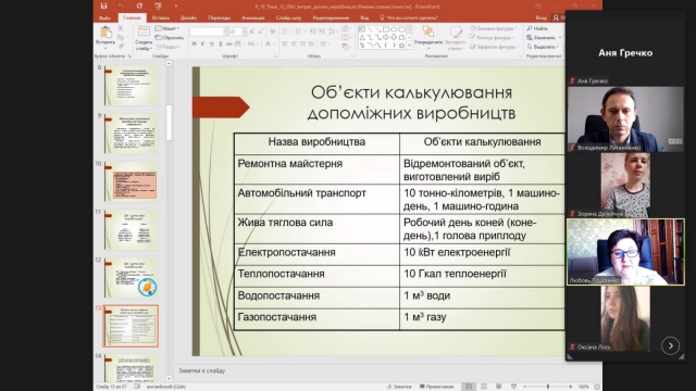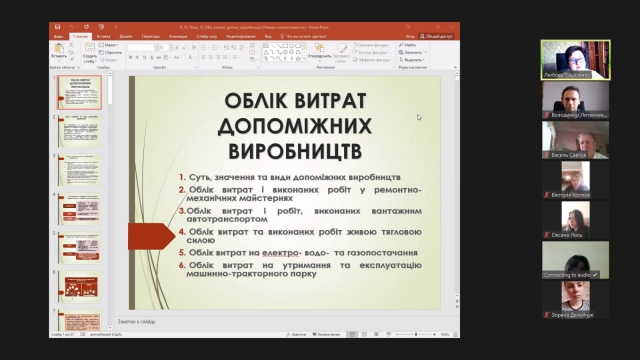 Любов Гуцаленко розкрила питання сутності, значення та видів допоміжних виробництв. Було розглянуто особливості обліку витрат і виконаних робіт у ремонтно-механічних майстернях, робіт та послуг наданих вантажним автотранспортом, живою тягловою силою, обліку витрат електро- водо- та газопостачання та обліку витрат на утримання і експлуатацію машинно-тракторного парку із наведеними практичними прикладами у презентаційному матеріалі, щодо визначення собівартості об’єктів калькулювання, з метою формування фахових компетентностей у здобувачів спеціальності 071 «Облік і оподаткування».