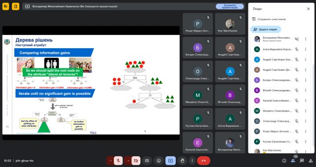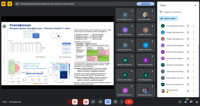 17 березня 2025 року відбулася згідно встановленого графіку відкрита лекція професора кафедри економічної кібернетики Володимира Миколайовича Кравченка. Відкрита лекція проходила в рамках вибіркової для магістрів всіх освітніх програм НУБіП України дисципліни “Машинне навчання” на тему “Класифікація. Дерева рішень”. Заняття пройшло в дистанційному форматі з використанням платформи відеоконференцій Google Meet. Лектор розпочав із пояснення суті класифікації, яка полягає у розподілі об'єктів на дискретні класи на основі певних характеристик. Це фундаментальна задача в машинному навчанні, що знаходить застосування в різних галузях, таких як розпізнавання зображень, обробка природної мови та прогнозування. Особливу увагу було приділено таким метрикам оцінки якості класифікатора, як: позитивна точність (precision), повнота (recall), F1-міра (f1-score) та загальна точність (accuracy). Ці метрики є критично важливими для розуміння продуктивності класифікатора та вибору найкращого алгоритму для конкретної задачі.