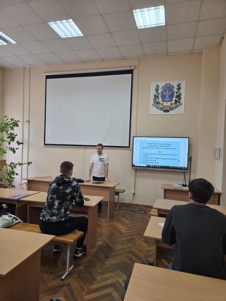 29 вересня 2025 р. було проведене лекційне заняття старшим викладачем кафедри теорії та історії держави і права, к.ю.н. Тарасом Панталієнком з дисципліни «Історія держави і права зарубіжних країн» на тему «Загальна характеристика держави і права епохи Середньовіччя. Держава і право франків» для студентів 1 курсу спеціальності «Право» в очному форматі.