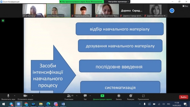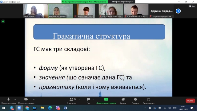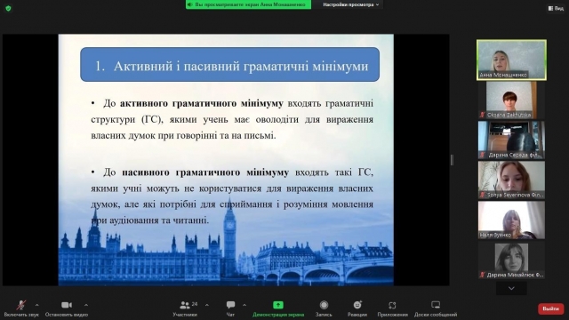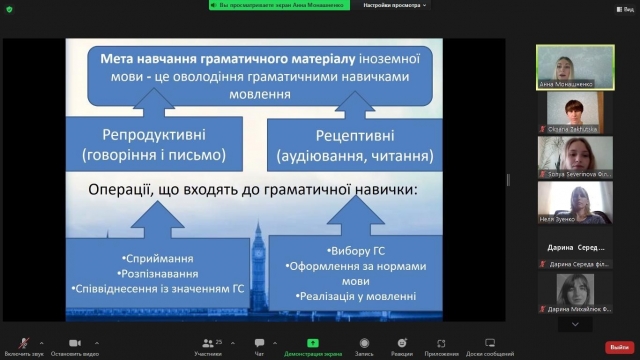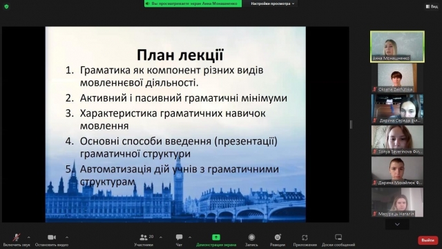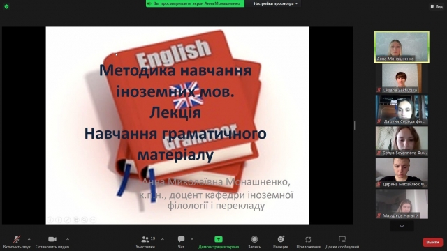 14 вересня 2022 року відбулося відкрите лекційне заняття доцента кафедри іноземної філології і перекладу Монашненко Анни Миколаївни для студентів 4 курсу спеціальності «Філологія» з дисципліни «Методика навчання іноземних мов» на тему «Навчання граматичного матеріалу» з використанням платформи zoom. Окрім студентів, на занятті були присутні викладачі кафедри іноземної філології і перекладу, а саме: завідувач кафедри, доктор педагогічних наук, професор Амеліна Світлана Миколаївна; кандидат філологічних наук, доцент Захуцька Оксана Володимирівна; кандидат педагогічних наук, доцент Зуєнко Неля Олександрівна, старший викладач Колесник Марія Юріївна.