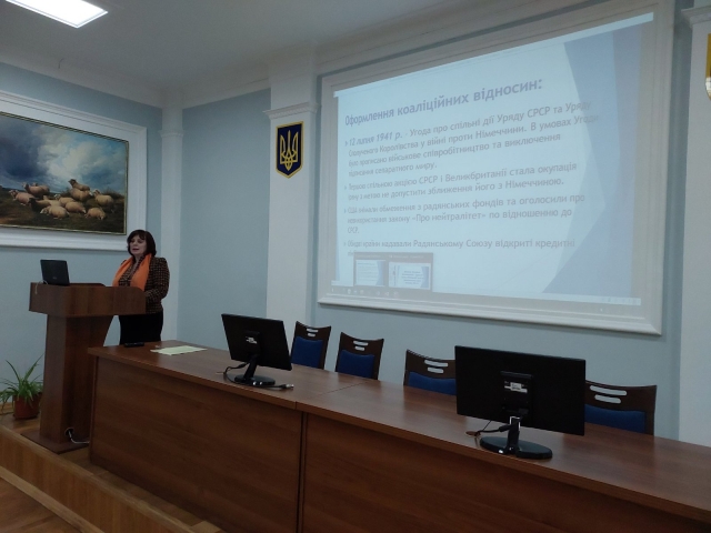 Лекція розпочалася вчасно, було чітко визначено тему, план, мету та завдання лекції, її значення та зв’язок із попереднім навчальним матеріалом. Олена Любовець докладно зупинилася на специфіці міждержавних відносин навколо створення антигітлерівської коаліції та відкриття другого фронту, проаналізувала позицію та інтереси кожної з провідних країн-учасниць антигітлерівської коаліції. Під час лекції було спростовано низку російських наративів щодо зазначеної проблематики.