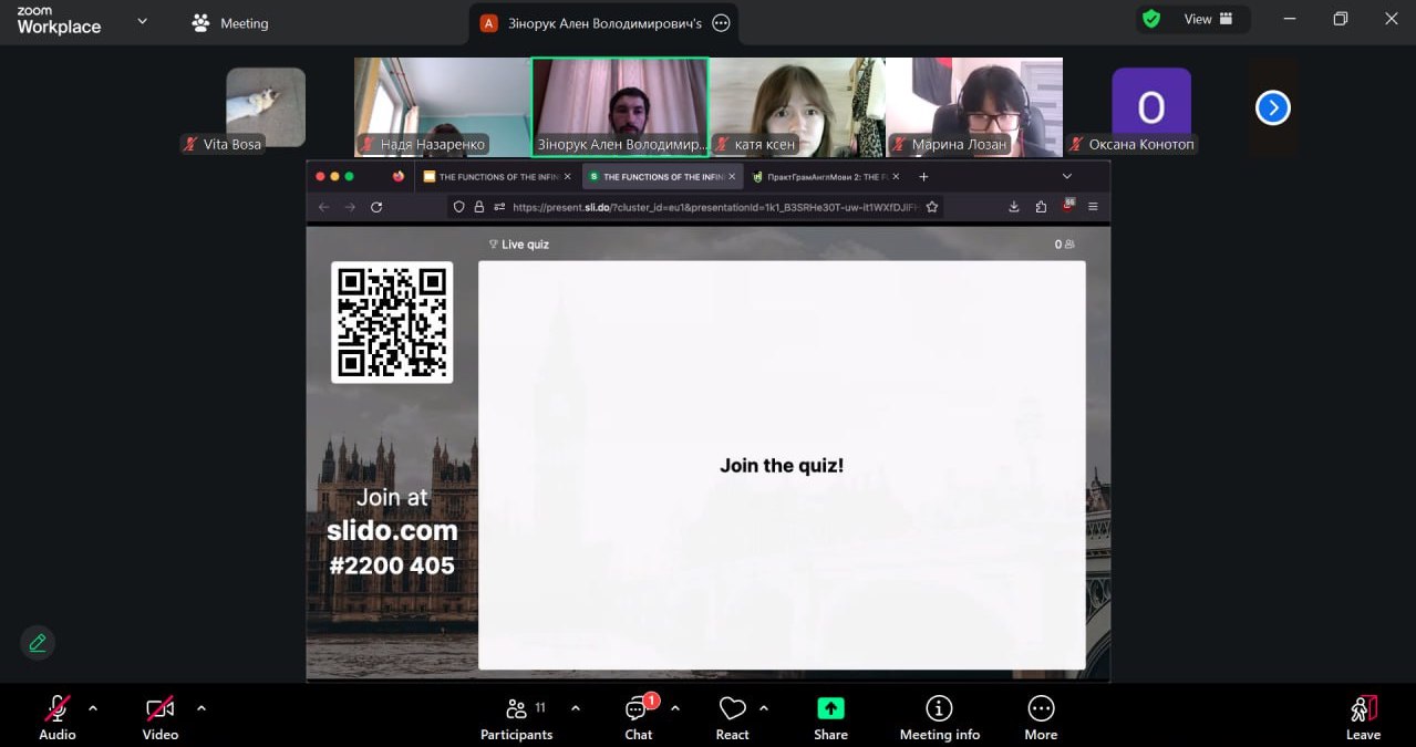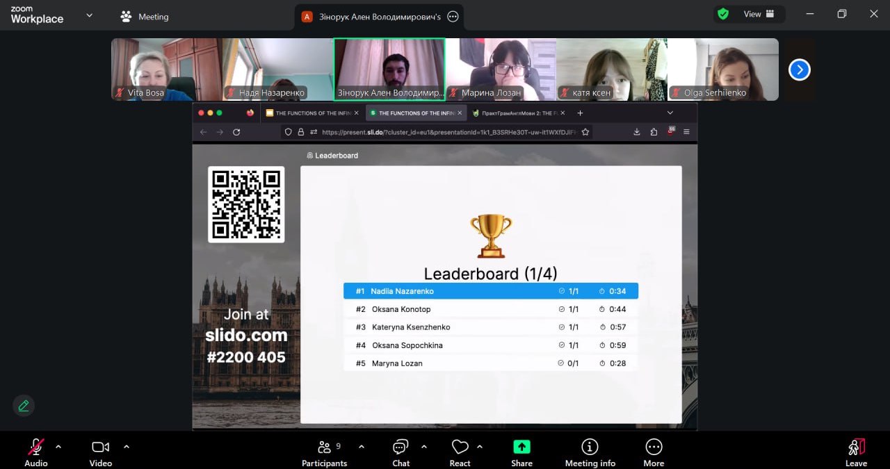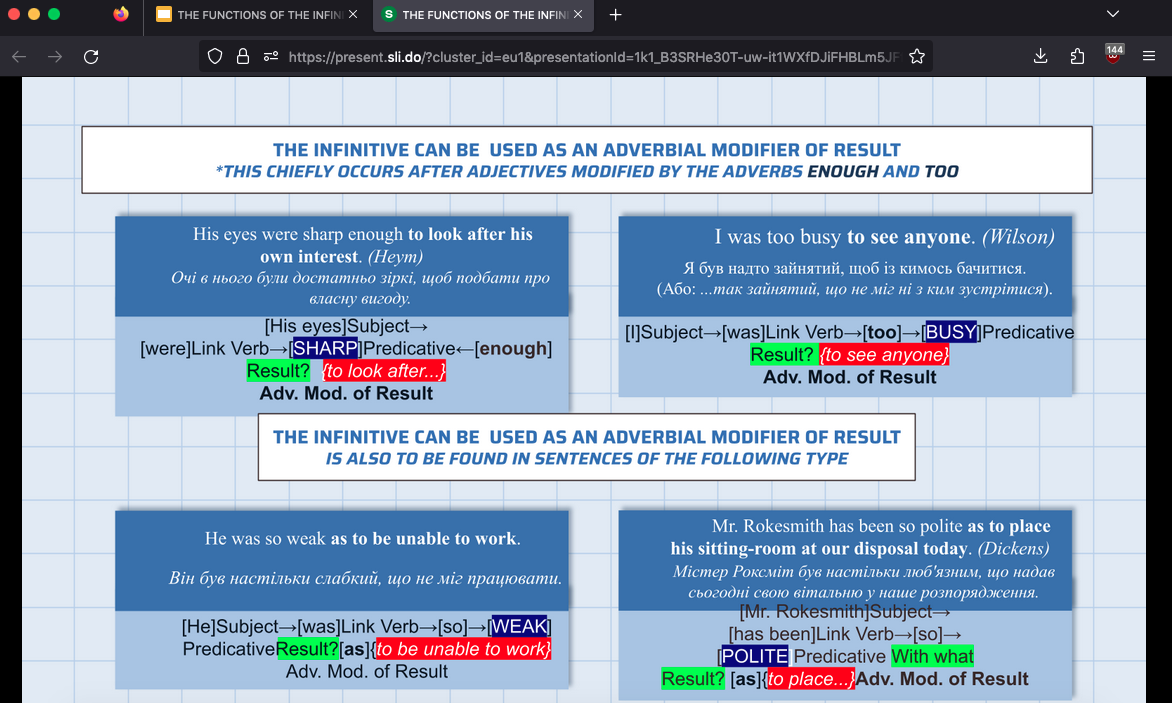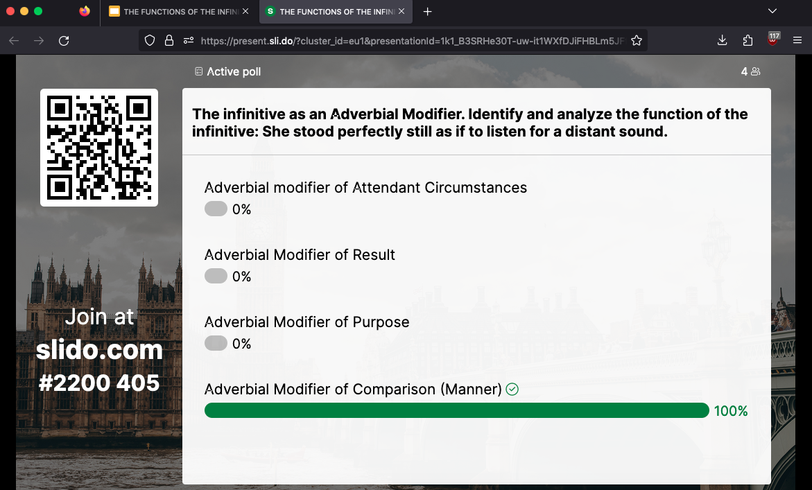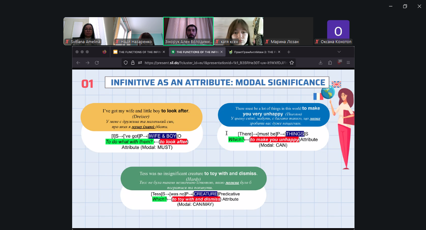 Методично заняття поєднувало пояснювально-аналітичний і проблемно-пошуковий підходи з елементами інтерактивного навчання. Важливою складовою став безперервний моніторинг навчальної діяльності, реалізований через поєднання функціоналу платформ E-learn та Slido. У режимі реального часу студенти брали участь у миттєвій ідентифікації функцій інфінітива (Attribute vs Adverbial Modifier) в автентичних реченнях та долучалися до голосування за правильне тлумачення інфінітива-означення після порядкових числівників і прикметника the last. Ключовим інструментом виступив дистрибутивний аналіз, що дозволив аргументовано розмежувати функції інфінітива.