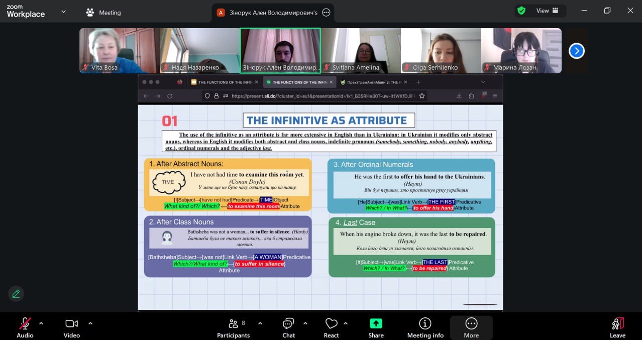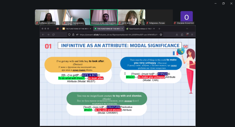 Заняття було присвячено поглибленому вивченню граматичної системи англійської мови. Основна увага була зосереджена на детальній дескрипції синтаксичної багатофункціональності інфінітива як одного з найбільш релевантних засобів лаконізації мовлення. Основний фокус дослідження було спрямовано на явище контекстуальної конвергенції, де інфінітивні конструкції виявляють високу зовнішню подібність, проте реалізують принципово різні типи синтаксичного зв’язку.