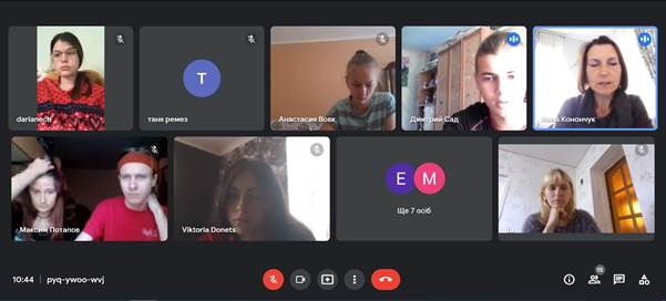 9 вересня 2022 року відбулося відкрите заняття старшого викладача кафедри іноземної філології і перекладу Конончук Інни Валеріївни для студентів групи ГРС 2.1. з дисципліни «Друга іноземна мова» на тему «Was habe ich gestern gemacht» з використанням платформи GOOGLE Meet. Окрім студентів, на занятті були присутні викладачі кафедри іноземної філології і перекладу, а саме: завідувач кафедри, доктор педагогічних наук, професор Амеліна Світлана Миколаївна; кандидат педагогічних наук, доцент Зуєнко Неля Олександрівна; кандидат філологічних наук, доцент Захуцька Оксана Володимирівна; старший викладач Колесник Марія Юріївна.