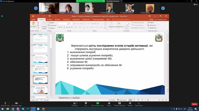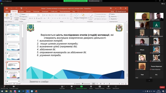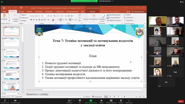 У ході заняття професор Сергій Кубіцький, спираючись на визначений план його проведення, ініціював дискусійну розмову щодо узгодження розуміння сутності поняття «мотивація», розглянув основні теорії трудової мотивації працівників із узагальненням структури основних мотивів педагогічних працівників закладу освіти. Звернуто було увагу слухачів на небажаний для закладу освіти процес демотивації педагогічної діяльності та його попередження. Обговорено техніку мотивування педагогів, основні умови формування мотивації їх творчої діяльності та умови мотивації професійного вдосконалення керівників закладу освіти.