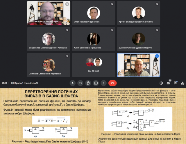 Кафедра комп’ютерних систем, мереж та кібербезпеки провели відкриту онлайн лекцію для студентів 1 курсу спеціальності «Комп’ютерна інженерія» та «Кібербезпека» з дисципліни Комп’ютерна логіка на тему «Перетворення логічних виразів». Лектор, доцент кафедри комп’ютерних систем, мереж та кібербезпеки доцент Євгеній Нікітенко.