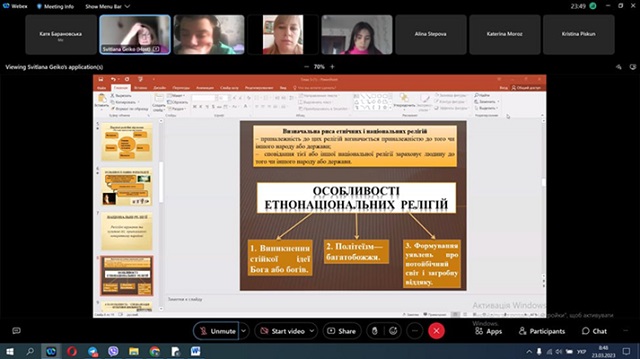23 березня 2023 р. відбулася відкрите заняття доцентки кафедри філософії та міжнародної комунікації Світлана Гейко з дисципліни «Релігієзнавство». Лекція була присвячена національним релігіям, характеристиці визначальних рис та особливостям національних релігій. У ході навчальної взаємодії здобувачі вищої освіти були ознайомленні з характерними рисами та особливостями національних релігій: релігій Стародавнього Єгипту та Греції (ранні національні релігії); іудаїзмом, зороастризмом, індуїзмом (пізні національні релігії).