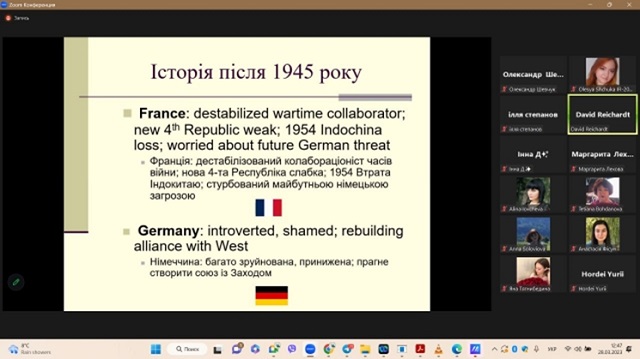 Продовжили цикл березневих лекцій викладачі кафедри міжнародних відносин і суспільних наук. Так, 28 березня 2023 року було організувано відкриту лекцію на тему «Інтеграційні процеси в Європейському регіоні у XX ст.», яка реалізується в рамках Модулю Жана Моне EVADEM. Активними учасниками заходу були студенти 3 та 4 курсів спеціальності «Міжнародні відносини, суспільні комунікації та регіональні студії». Головними запрошеними гостем відкритої лекції був професор Університету Коменського в Братиславі – Девід Рейхард.