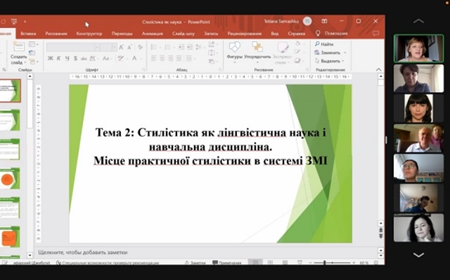 Розпочала серію березневих відкритих зустрічей зі студентською молоддю різних факультетів та спеціальностей професорка кафедри журналістики та мовної комунікації Тетяна Семашко із он-лайн лекцією з теми «Стилістика як лінгвістична наука і навчальна дисципліна. Місце практичної стилістики в системі ЗМІ», яка була прочитана студентам 3 курсу спеціальності «Журналістика» з навчальної дисципліни «Практична стилістика» у перший день весни.
