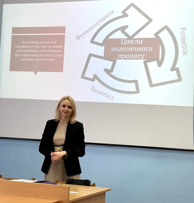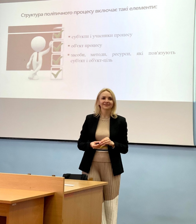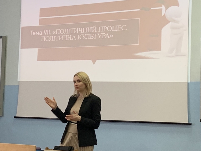 Наталія Володимирівна провела відкриту лекцію для студентів 3 курсу спеціальності «Автоматизація та комп’ютерно-інтегровані технологій» ННІ енергетики, автоматики і енергозбереження з навчальної дисципліни «Політологія та соціологія» на тему «Політичний процес та політична культура». Під час лекції Наталія Володимирівна зазначила мету, актуальність теми та закцентувала увагу на основних завданнях.