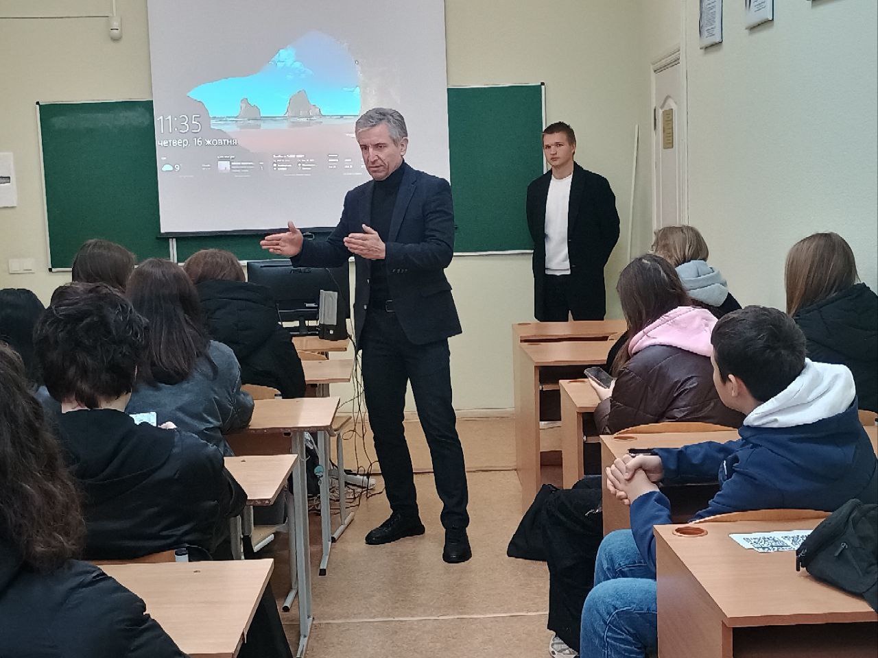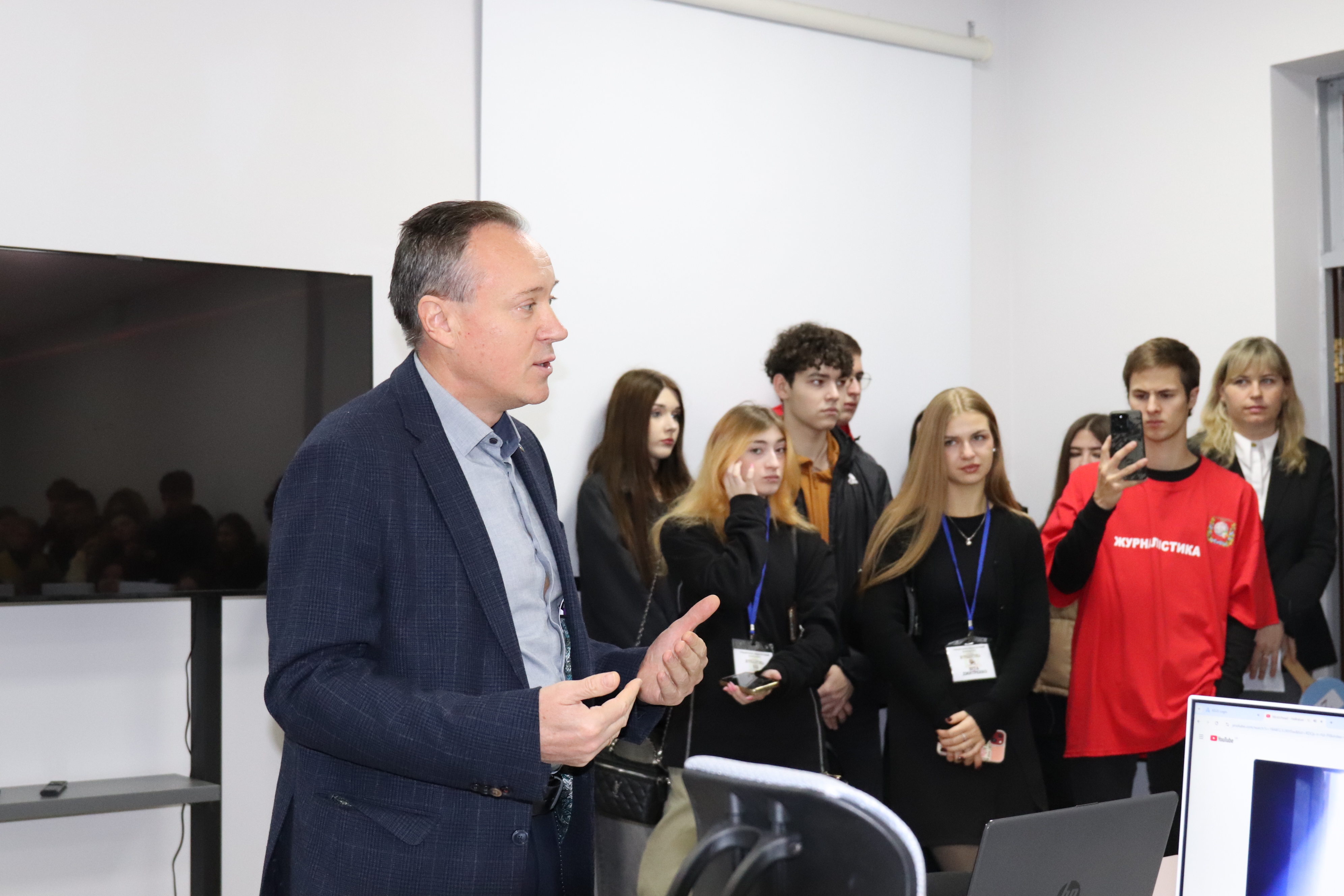Майбутні студенти пройшли просторими коридорами, завітали до світлих аудиторій та кабінетів, наповнених духом науки та студентського життя. Їх одразу провели до кафедр, де учнів зустрів Руслан Васильович - професор, доктор педагогічних наук, відчинивши не просто двері корпусу, а двері у світ науки та насиченого навчання. Перша зупинка - лабораторія інформаційних комунікацій, де він розповів багато цікавого: про можливості навчання за кордоном, програму подвійного диплому, найкращу пропорцію у кількості бюджетних місць і про широкі перспективи для молоді. Крім того, нагадав школярам слова Григорія Сковороди про “сродну працю”- про те, що кожна людина має знайти свою справу; працю, для якої вона народжена та має природний хист. Оскільки в нашу еру технологій, де кожен день приносить зміни та нові відкриття, багато професій втрачають свою актуальність. “Сьогодні перед молоддю стоїть складний вибір - яку спеціальність обрати, щоб бути потрібним у майбутньому” - сказав Руслан Васильович. У цьому контексті він згадав декілька ситуацій із використанням штучного інтелекту. Усі спроби використання були невдалими, неправдивими. Тож таким чином він довів незамінність гуманітарних професій.