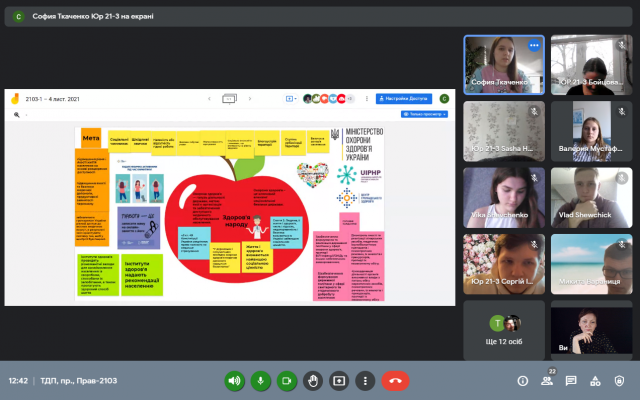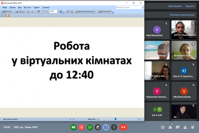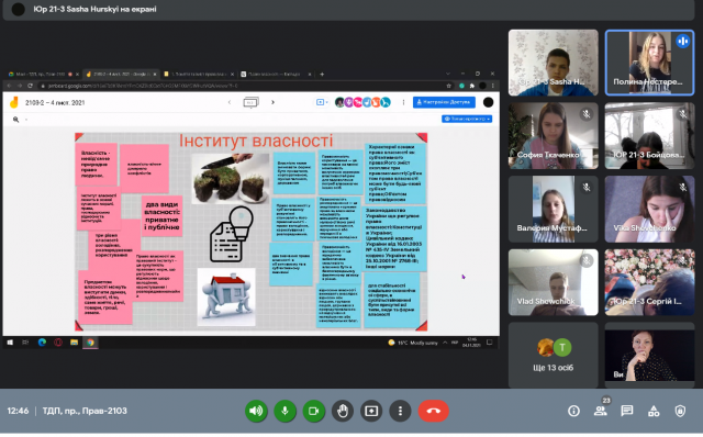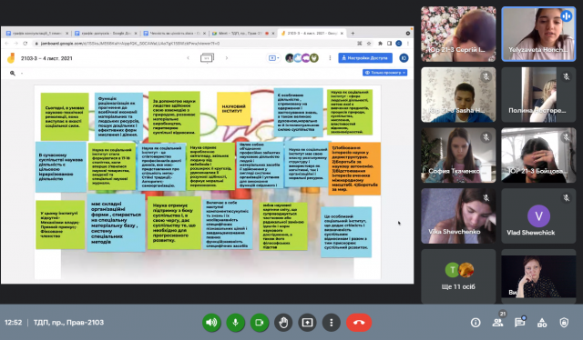 На цьому тижні групи 1 курсу юридичного факультету були розподілені по кімнатах викладачем і шляхом онлайн жеребкування (онлайн-сервіс Wheelofnames) через демонстрацію екрану отримували своє індивідуальне завдання. Потім за активними покликаннями переходили у свої кімнати прориву, де на них чекала командна віртуальна дошка і 40 хвилин для вироблення колективного рішення. Після цього вони поверталися в загальну кімнату, де представляли результати своєї роботи. Потому, традиційно, обговорення почутого, допущених хиб та визначення навичок, які ще потребують відпрацювання.