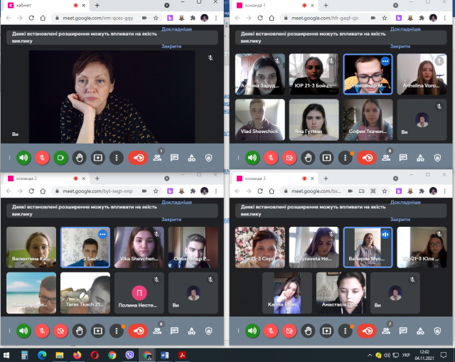 Інша справа – забезпечити команду роботу у дистанційному форматі. Крім того, результати опитування перших дистанційних занять у жовтні засвідчили бажання студентів працювати у команді саме в малих групах. Наразі корпоративний Google Meet не надає можливості використовувати сеанси підгруп. Тому довелося скористатися застосунком Google Meet Breakout Rooms, щоб організувати роботу групи у кімнатах прориву. Відтепер кожного практичного заняття студенти отримують свій номер кімнати або самостійно визначають, в якій із кімнат вони будуть працювати (і така демократична форма як «право вільної ноги» має місце!).