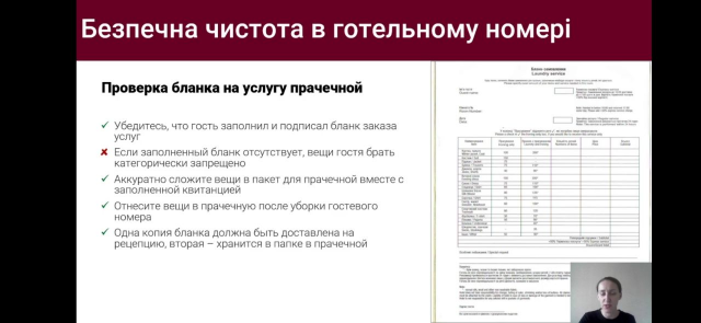 З даного вебінару ми дізналися про нові правила прибирання в номерах, цікаві лайфхаки, які ми можемо використовувати не тільки у готелі, але навіть у повсякденному житті говорить Анна Бованенко. Цікаво було слухати представника з готелю Reikartz Hotel Group ще й тим, що це була не просто цікава розповідь, а й задавалися питання по вже вивченому нами матеріалу, на які ми надавали відповіді.