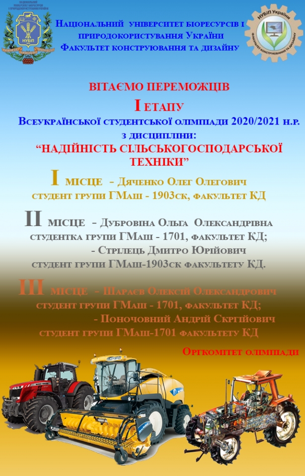 Вітаємо переможців Всеукраїнської студентської олімпіади 2020/2021 н. р. з навчальної дисципліни "Надійність сільськогосподарської технікм" ср, 14 кві 2021 - 03:00