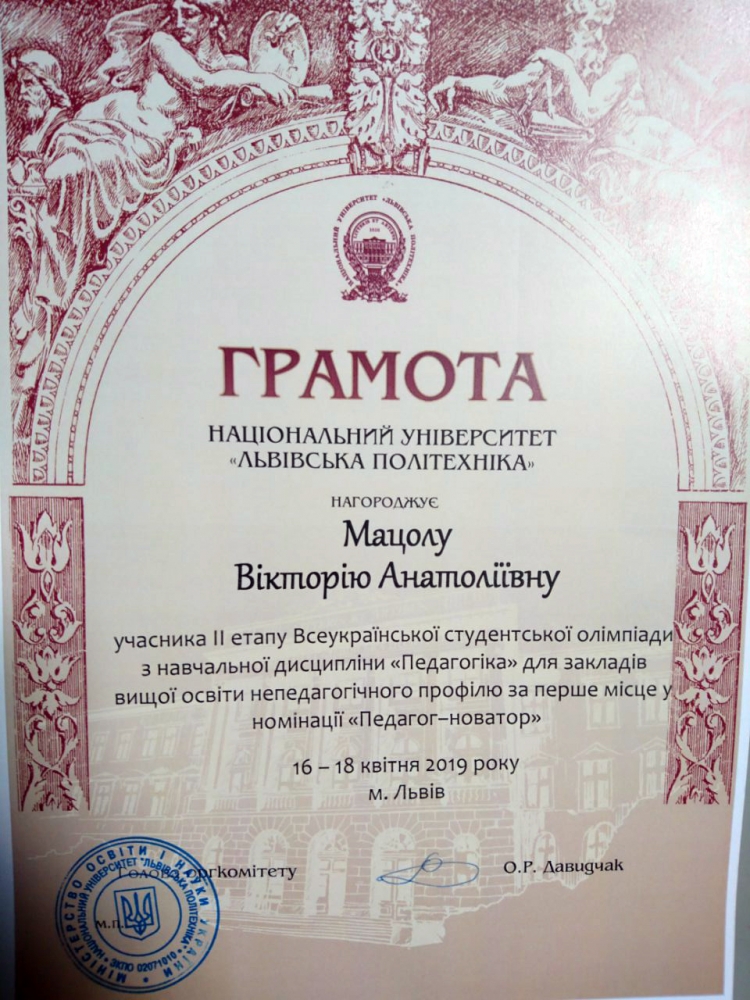 Вітаємо Вікторію Мацолу з призовим місцем на Всеукраїнській студентській олімпіаді з дисципліни «Педагогіка»