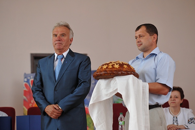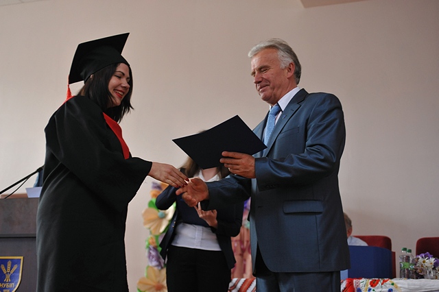 Випускники отримали музичні привітання від студентів другого курсу факультету аграрного менеджменту Дарини Лукашук та Данила Карачевського. До слова було запрошено батьків випускників Наталію та Сергія Врублевських, які звернулися до дітей з напутніми словами та в знак шани і подяки, вручили ректору коровай.