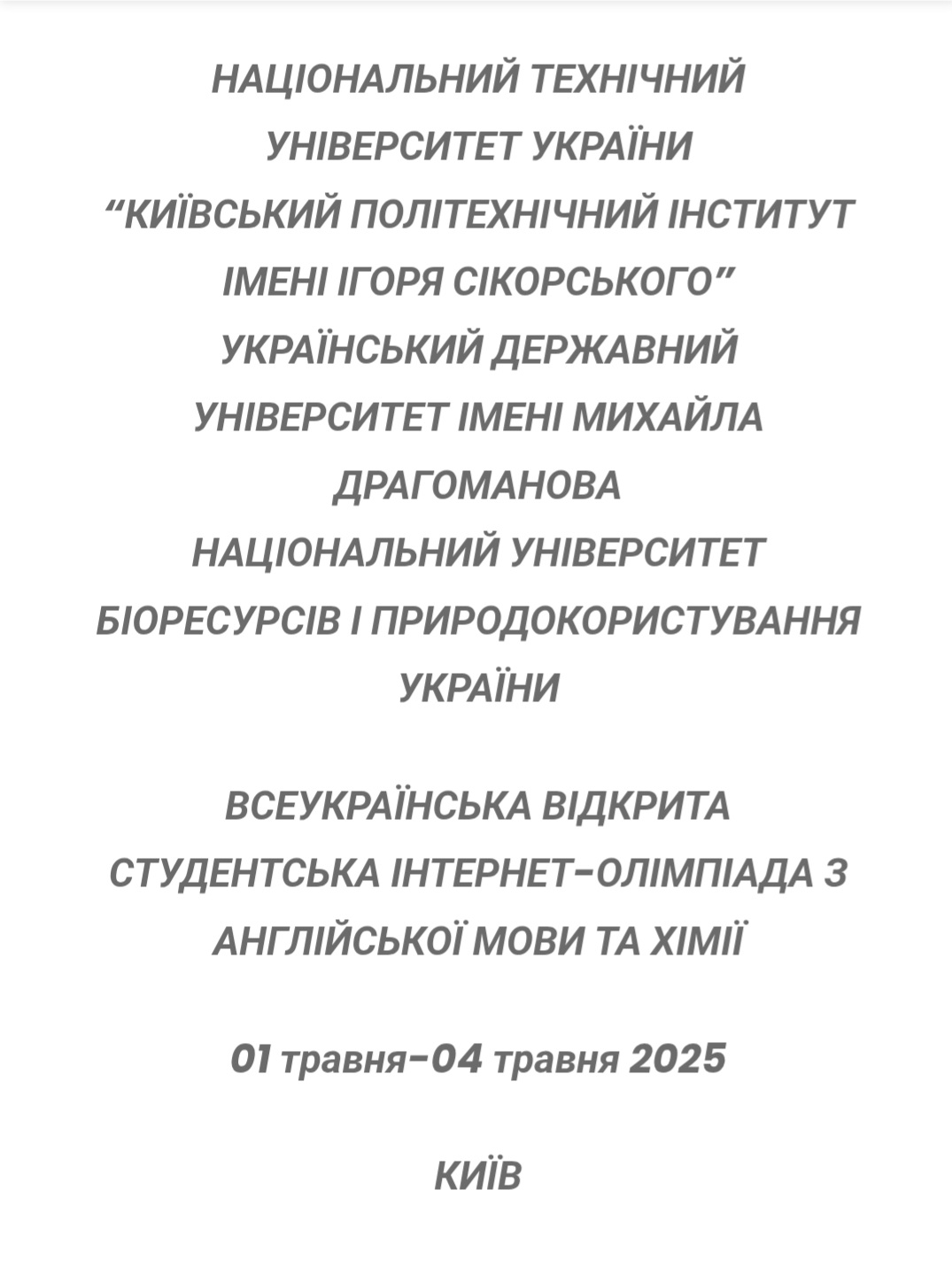 З 1 по 4 травня 2025 року відбувся другий етап Всеукраїнської відкритої студентської інтернет-олімпіади з англійської мови та хімії для студентів 1–2 курсів бакалаврату немовних спеціальностей. Учасниками інтелектуального змагання стали студенти з великої кількості різних університетів України, які продемонстрували високий рівень знань, креативність і прагнення до саморозвитку.