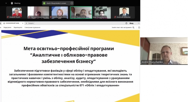 Декан наголосив, що постійна увага і зусилля гаранта ОПП «Аналітичне і обліково-правове забезпечення бізнесу» Анатолія ШИША, завідувача кафедри статистики та економічного аналізу Андрія МУЗИЧЕНКА, членів проєктної групи, НПП кафедри статистики та економічного аналізу спрямовані на якісне практико-орієнтоване навчання, що відповідає вимогам роботодавців в частині компетентностей, знань та вмінь майбутнього бухгалтера-аналітика. Для досягнення цього кафедрою налагоджена тісна співпраця з стейкголдерами освітньої програми, в тому числі бізнес-структурами та громадськими організаціями. Адже саме кафедра є з’єднуючою ланкою між студентом та роботодавцем. Саме такого збалансованого підходу дотримується колектив кафедри, що і підтвердив у своїй доповіді завідувач кафедри статистики та економічного аналізу, доцент Андрій МУЗИЧЕНКО.