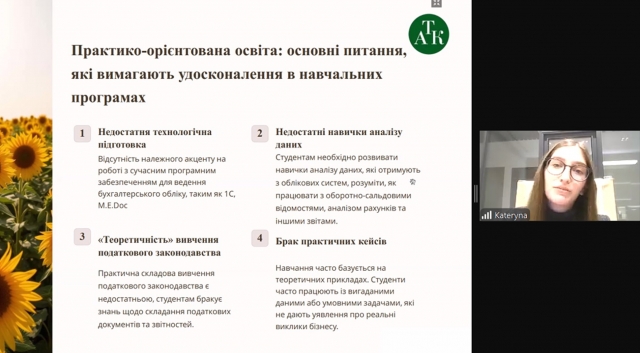 Для забезпечення системної оцінки можливостей і значення практичної підготовки студентів важливою є думка наших студентів. Тому цікавим, яскравим та наповненим практичними прикладами був виступ Вікторії ШТАКАЛ, здобувачки першого (бакалаврського) рівня вищої освіти за ОПП «Аналітичне і обліково-правове забезпечення бізнесу», який підтримали присутні на Всеукраїнському круглому столі колеги-студенти.