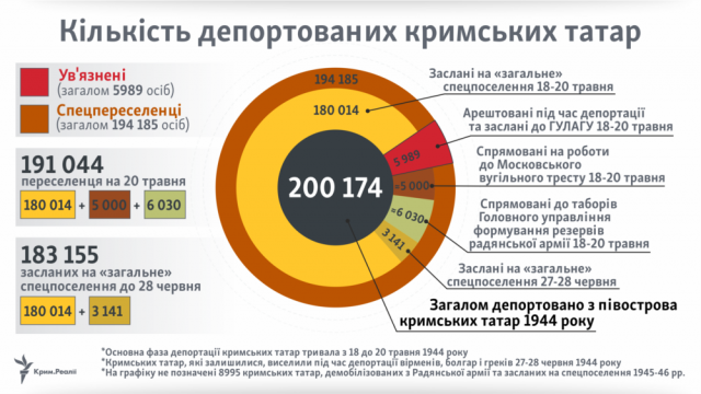 Останній ешелон з депортованими прибув до Узбекистану 8 червня 1944 року, частина кримських татар в дорозі загинула. Кількість таких за офіційними джерелами – 191 людина – викликає сумніви.