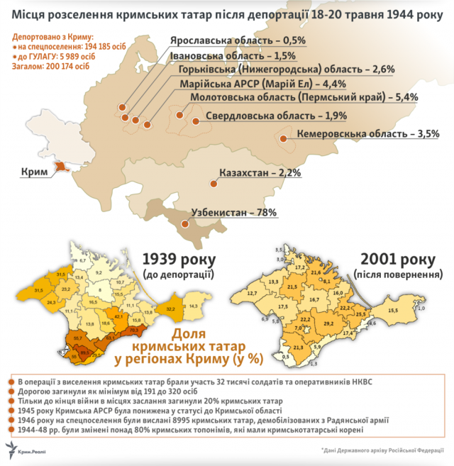 Наступною жертвою репресій за національною ознакою стали кримські татари, які підлягали депортації з території Кримського півострова. Згідно з офіційною радянською версією, «виселення» було пов’язане з «масовим дезертирством» 20 тисяч кримських татар на початку Другої світової війни, а також з нібито їх «тотальним колабораціонізмом» під час нацистської окупації півострова. Однак реальна кількість дезертирів серед кримських татар була порівняна з кількістю перебіжчиків інших національностей. До того ж, колективне покарання було заборонене ст. 50 чинної тоді Гаазької конвенції 1907 р. «Про закони і звичаї сухопутної війни». На думку багатьох істориків, Радянський Союз готувався до війни з Туреччиною за протоки Босфор і Дарданелли й «зачищав» у 1943-1944 роках Кавказ і Крим як тилові райони від можливо нелояльного населення.
